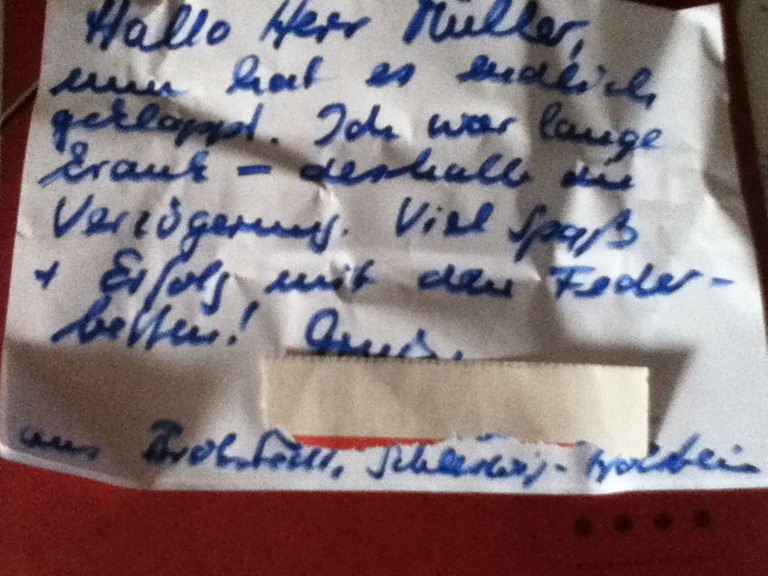 Oh ein kleiner Zettel mit einer Nachricht, das finde ich nett aber liebe Leute es ist nicht so schlimm wenn es mal länger dauern sollte Hauptsache ist das ihr mir die Federbetten auf jeden Fall mal zuschickt, wehrte Frau…. danke schön für ihr Paket.