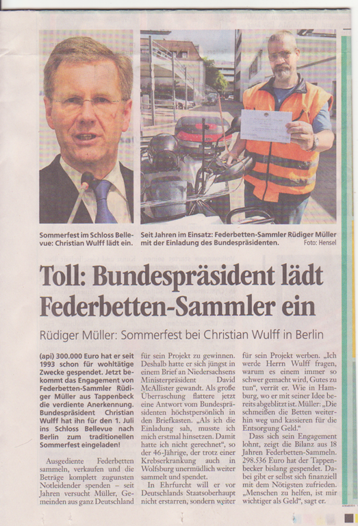 Nach der Erklärung der Einladung des Präsidenten Christian Wulff weiß ich jetzt warum ich sie bekommen habe. Es ist eine Anerkennung für das was ich bis jetzt geleistet habe.