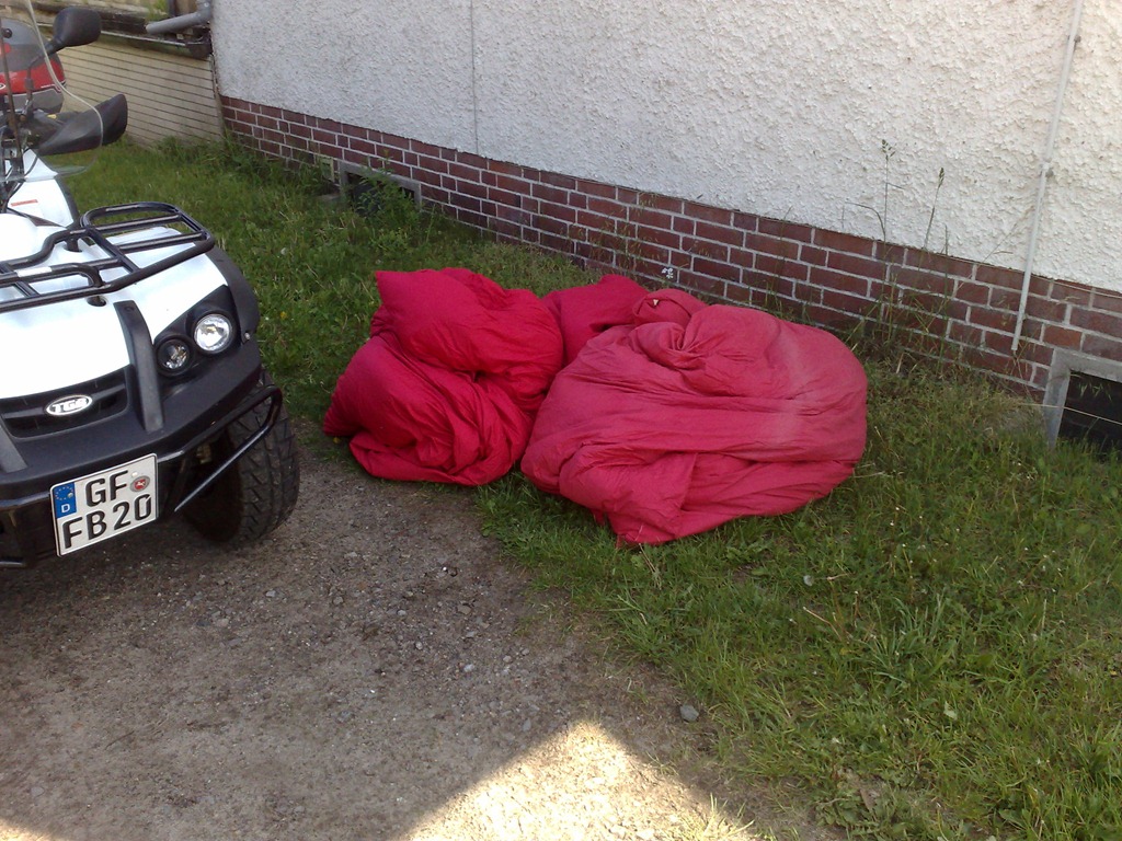 Sollen auch die Kissen mit, fragte ich was sie dann bejahte. Als wir die Federbetten dann zum Fahrzeug brachten, erzählte sie mir das noch ein Federbett im Schuppen sei was sie mir aber nicht mit geben wollte da Katzenpfoten drauf wären, ich zur ihr damit habe ich kein Problem das können sie mir auch noch geben.