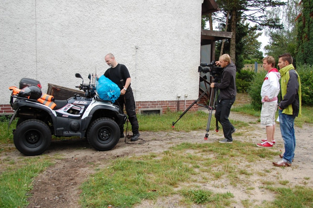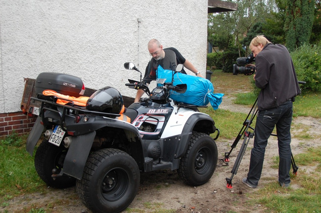 Nach dem fünften Mal ein Gang zur Garage, war man damit zufrieden, irgendwann stand das Quad vor der Garage und ich sollte den Plastiksack mit den nagelneuen Federbetten vorne auf den Gepäckträger befestigen, obwohl ich das alles konnte sagten sie mir wie ich es machen sollte damit es gut in der Kamera zu sehen ist.