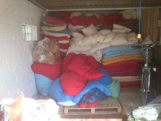 Die 365 kg aus Salzwedel waren ordentlich eingestapelt, machte ich am Nachmittag noch einmal das Tor auf und fand wieder einen riesengroßen Haufen vor dem ordentlich gestapelten Federbetten. Die weißen Federbetten, die auf den gestapelten versuchsweise raufgelegt worden sind mussten noch gewogen und eingestapelt werden. Läuft also wirklich sehr gut.