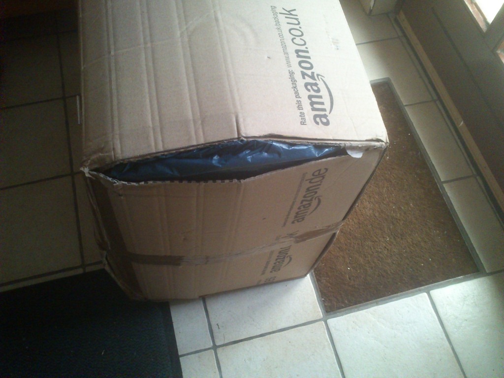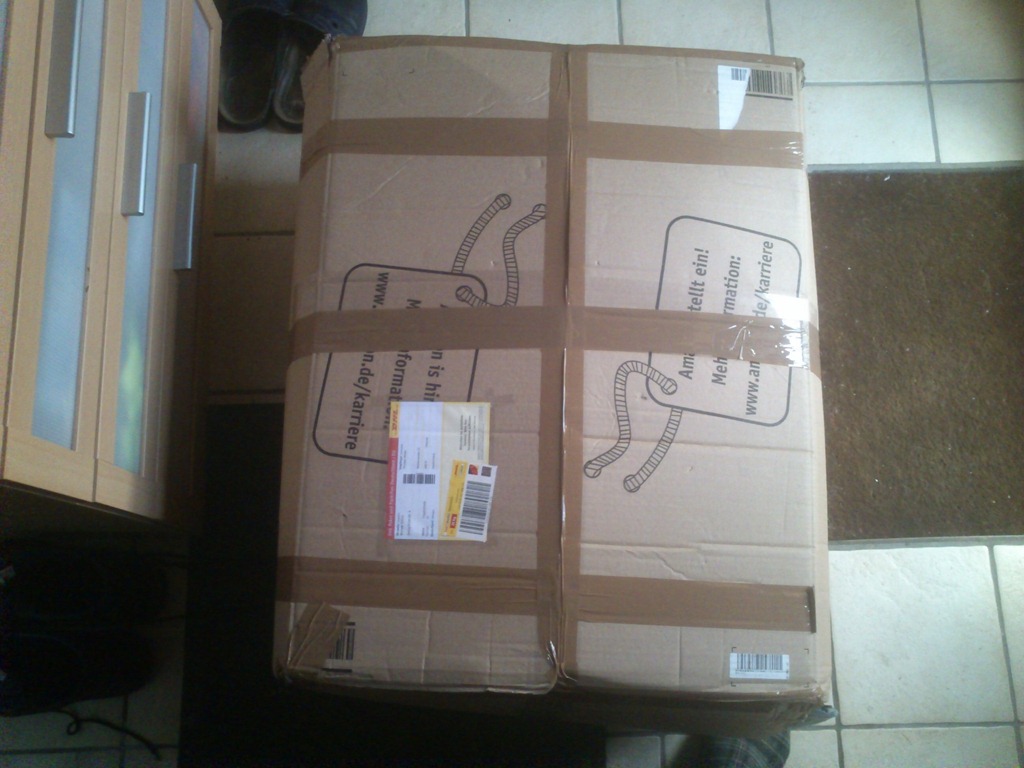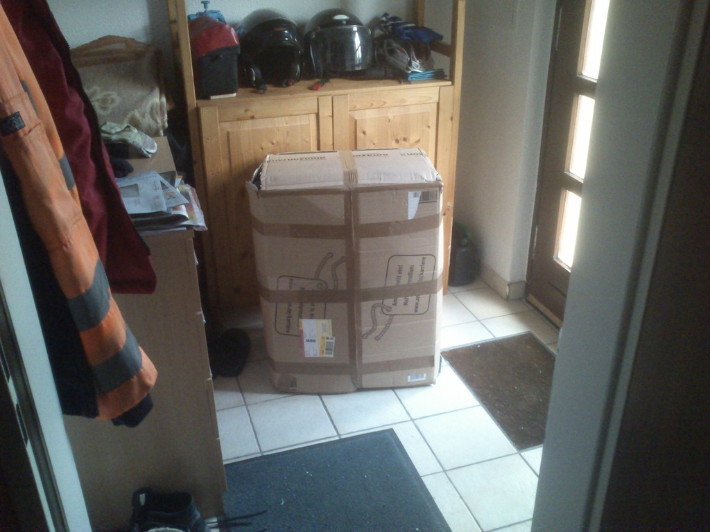 11:30 Uhr klingelte es an der Tür. Ich öffnete, niemand war zu sehen. Das Postauto kam und brachte mir ein riesengroßes Paket, ich musste dafür unterschreiben. Danach wurde mir das Paket ausgehändigt, ich verschloss die Tür und machte dieses Foto.