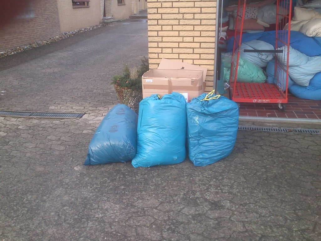 Paket vorsichtig aufgeschnitten und es kam ein blauer Plastiksack zum Vorschein, rausgenommen und es kam noch ein Plastiksack zum Vorschein auch den rausgenommen und noch ein Plastiksack entdeckte ich in dem Paket. Diese platzierte ich vor dem Karton und machte dieses Foto, nahm sie aus den Plastiksäcken heraus und legte sie zu den noch ungewogenen Federbetten , die ich am Freitag mit großer Unterstützung wieder wiegen werde.