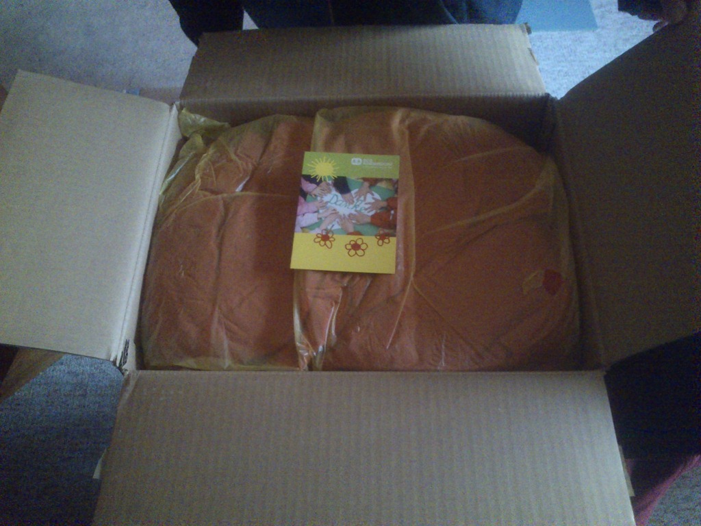 Ein Federbett geschützt durch einen gelber Plastiksack und da drauf eine Karte.