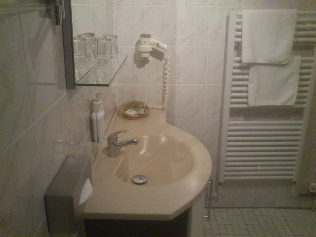 Sitzmöglichkeit, Schreibtisch und Fernseher. Dann schaute ich ins Badezimmer…