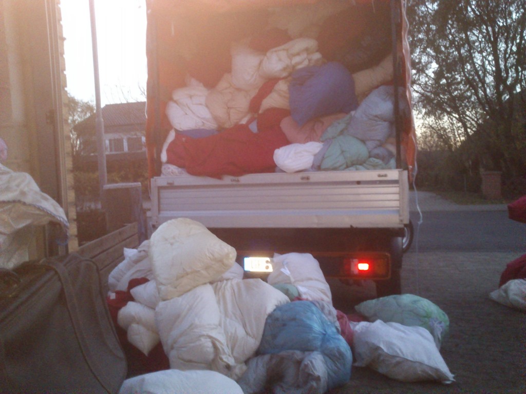 14:29 Uhr machte ich mich auf dem Weg nach Hause…16:39 Uhr fuhr ich rückwärts an die Garage öffnete die Plane, nachdem ich mich nochmal umgezogen hatte, 16:45 fielen diese ganzen Betten und Kissen alleine heraus…wo dieses letzte Foto entstand.