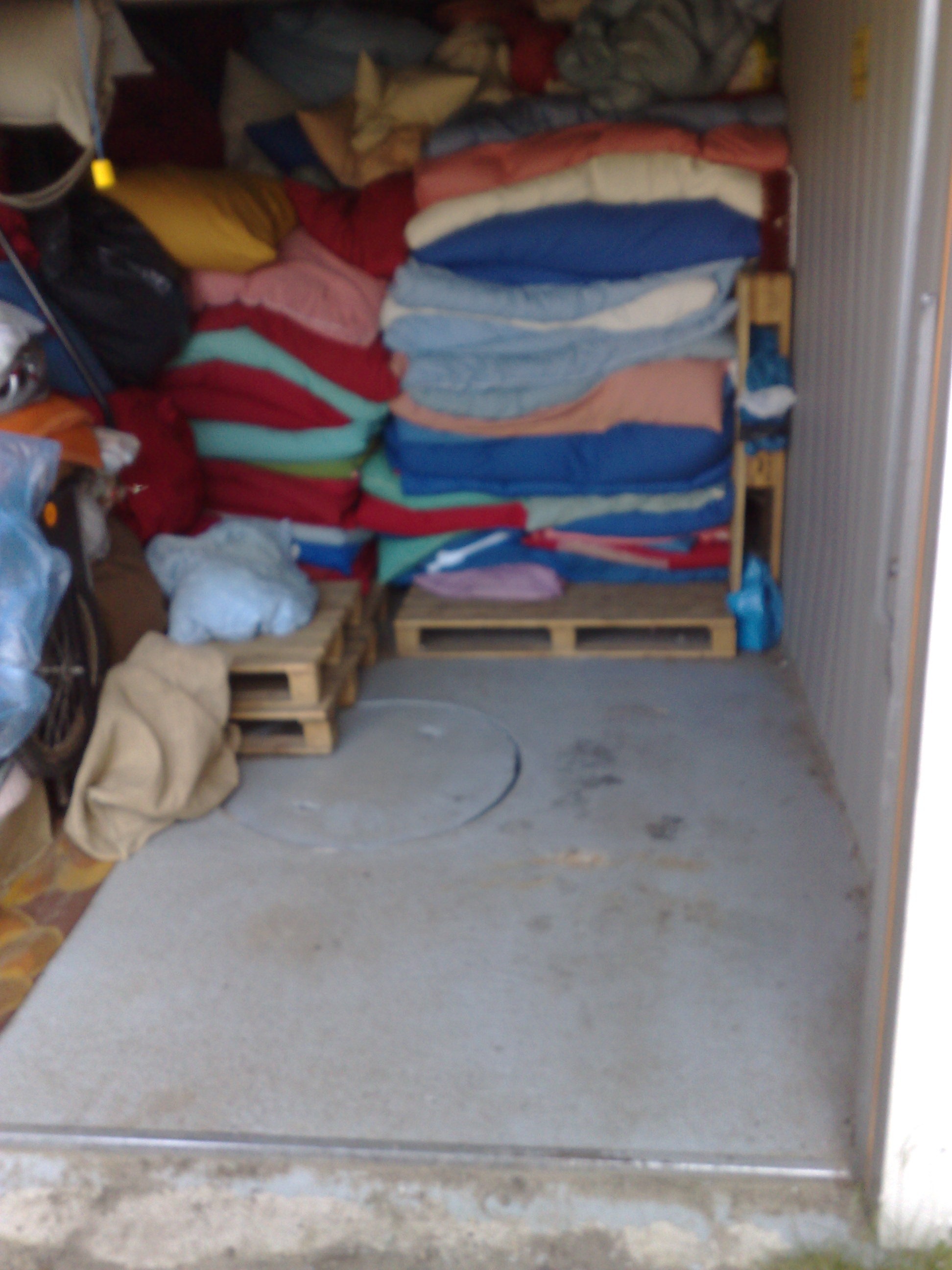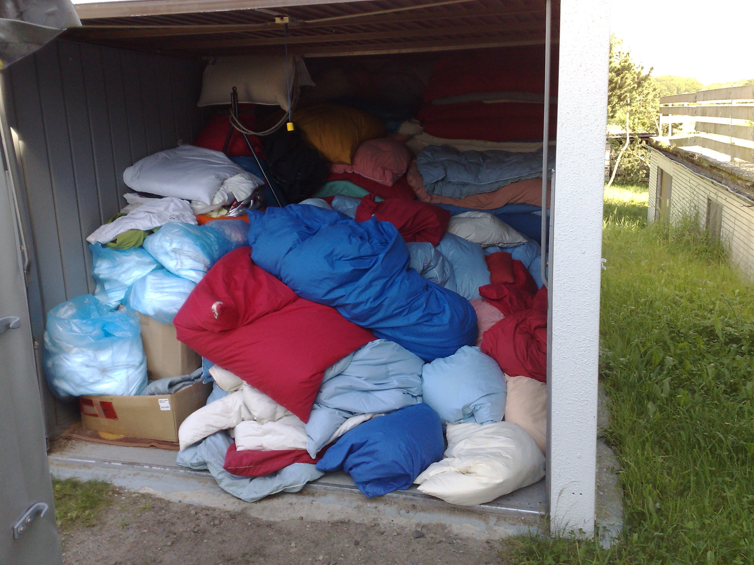 … so alles ausgeladen, puh das war viel. Hier liegen von der rechten Seite bis zu den Kartons 39 Federbetten und 47 Kissen. So sieht es doch sehr unordentlich aus oder? Also an die Arbeit…
