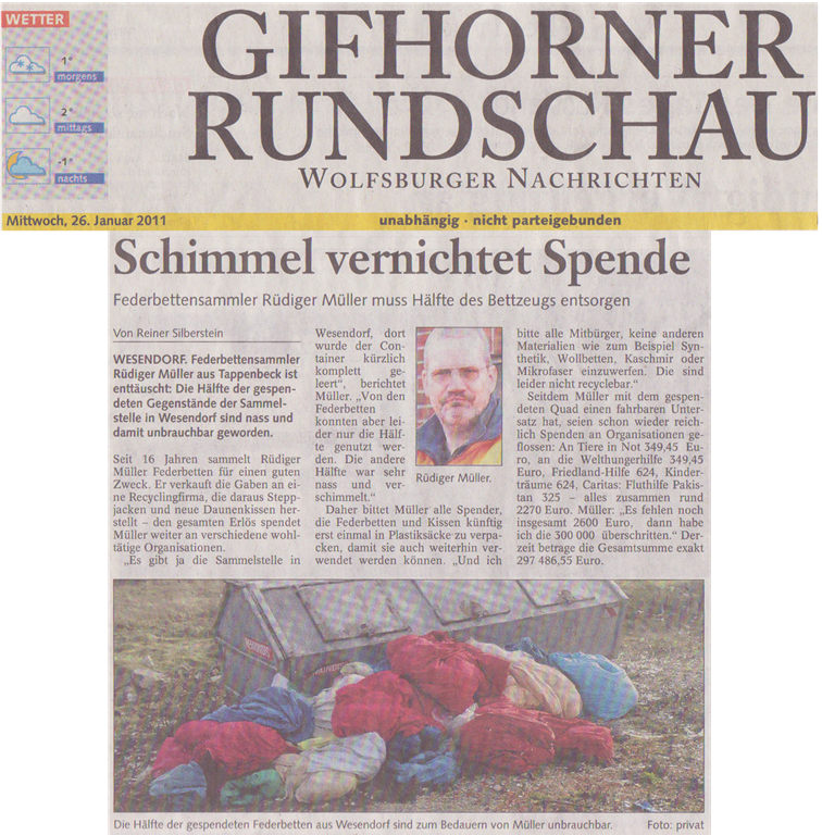 Die Bitte von Rüdiger Müller: „Bitte werfen Sie Ihre alten Federbetten nicht auf dem Sperrmüll weg!“ Wer seine spenden möchte, kann diese in Uelzen, wenn das Altpapier entsorgt wird, daneben stellen. Damit die Federbetten auch bei Regen nicht nass werden, sollten sie in einem Plastiksack verschlossen sein. Und wer mehrere hat, der kann sich gern an Rüdiger Müller selbst wenden. Gegen einen kleinen Unkostenbeitrag holt er sie aus Wolfsburg ab.