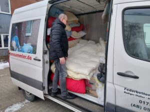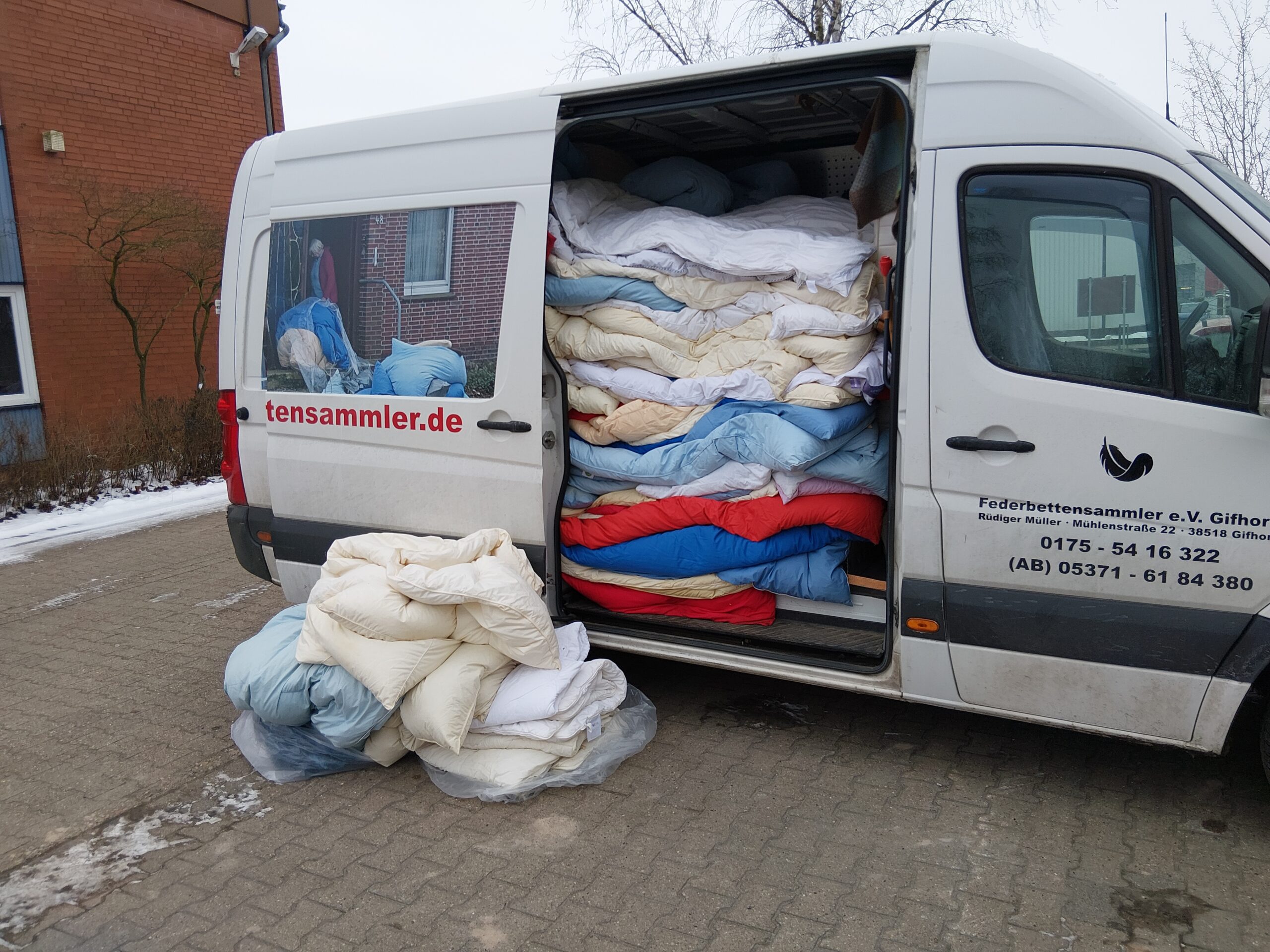 wir standen noch auf der Straße vor dem Gebäude und 10:52 nahm Johann die ersten Federbetten an. Dann wurde uns gezeigt wo wir stehen sollten und setzten das Fahrzeug um.